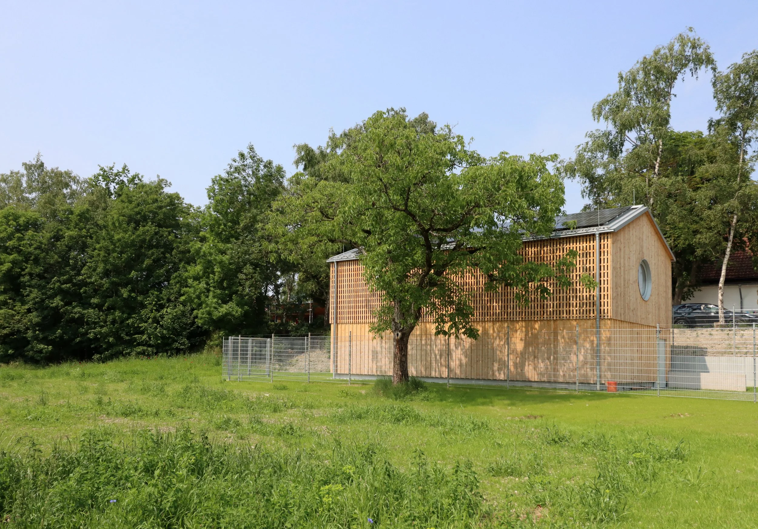 Der Neubau wird als zweigeschossiger, gestreckter Baukörper parallel zur südlichen Grenze positioniert und übernimmt somit die Wirkung einer schalltechnischen Trennung zwischen dem im Norden liegenden Außenbereich und den südlichen Wohngebäuden. Das Gebäude ist als konsequenter Holzbau konzipiert, sämtliche sichtbaren Oberflächen an Wänden und Decken werden in naturbelassenem Holz (z.B. Fichte / Weisstanne) ausgeführt, sodass ein haptisches und sensorisches Erleben des natürlichen Baustoffs überall sinnlich wahrnehmbar ist.